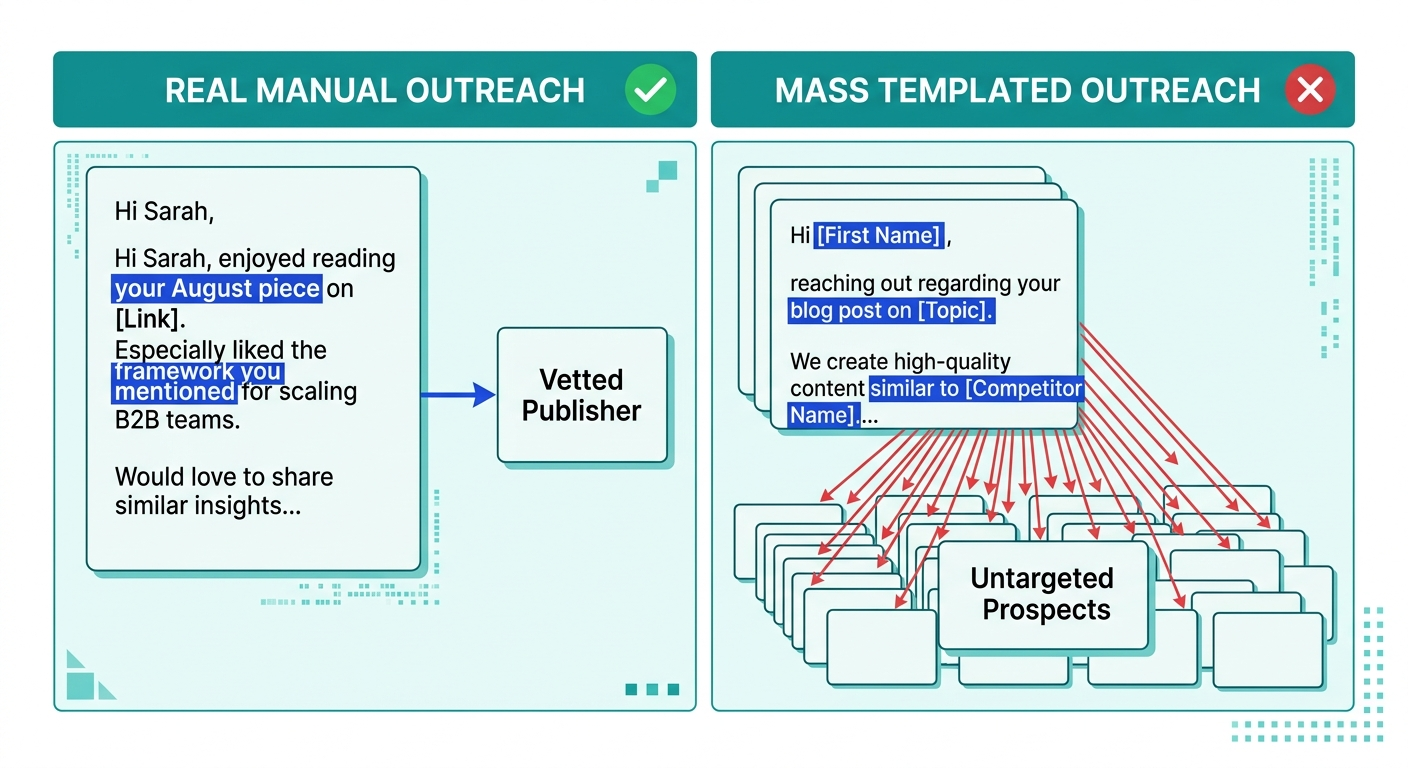 | $50–$150 | Templated outreach against a recycled publisher list. Thin content. Minimal qualification. | Accept-anyone sites, often with inflated traffic metrics. |